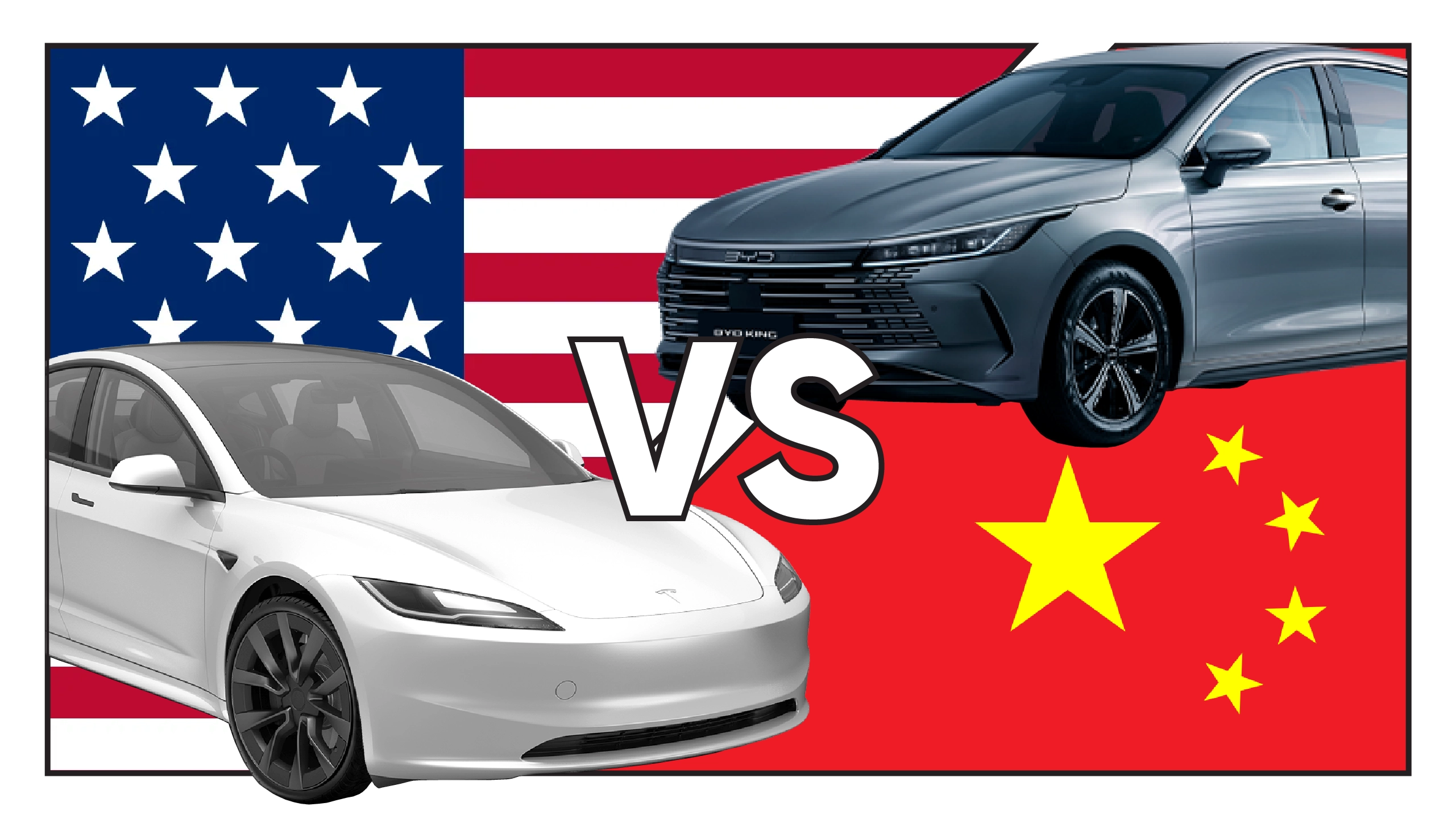 usa vs china EVsBy Car Appraiser / December 11, 2024 A Tesla and a BYD over their respective country flags representing the EV competition of the Chinese and US brands