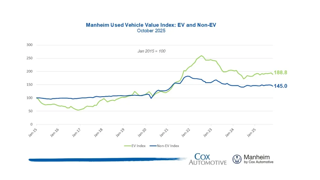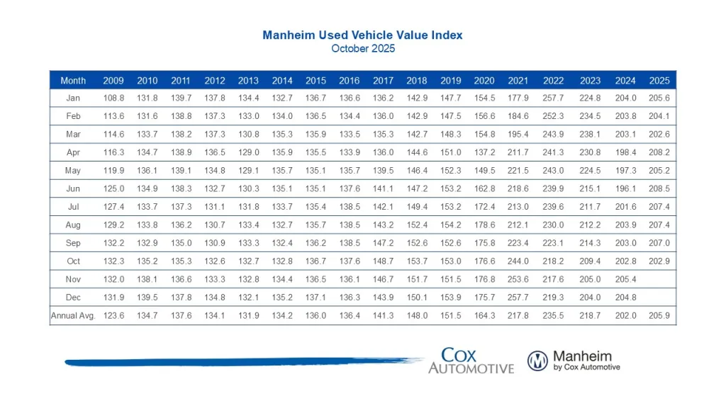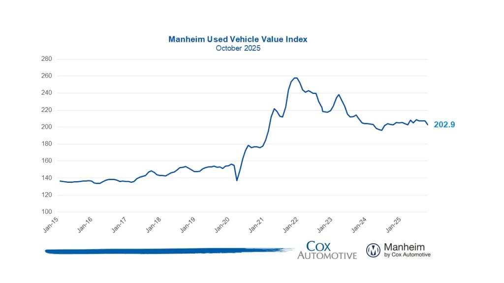 Manheim reports the Index at 202.9, a 2.0% month-over-month decline (seasonally adjusted) and roughly flat versus October 2024. Non-adjusted wholesale prices fell 3.7% from September and sat about 0.2% higher year over year. Manheim notes October often shows the steepest depreciation seasonally.
